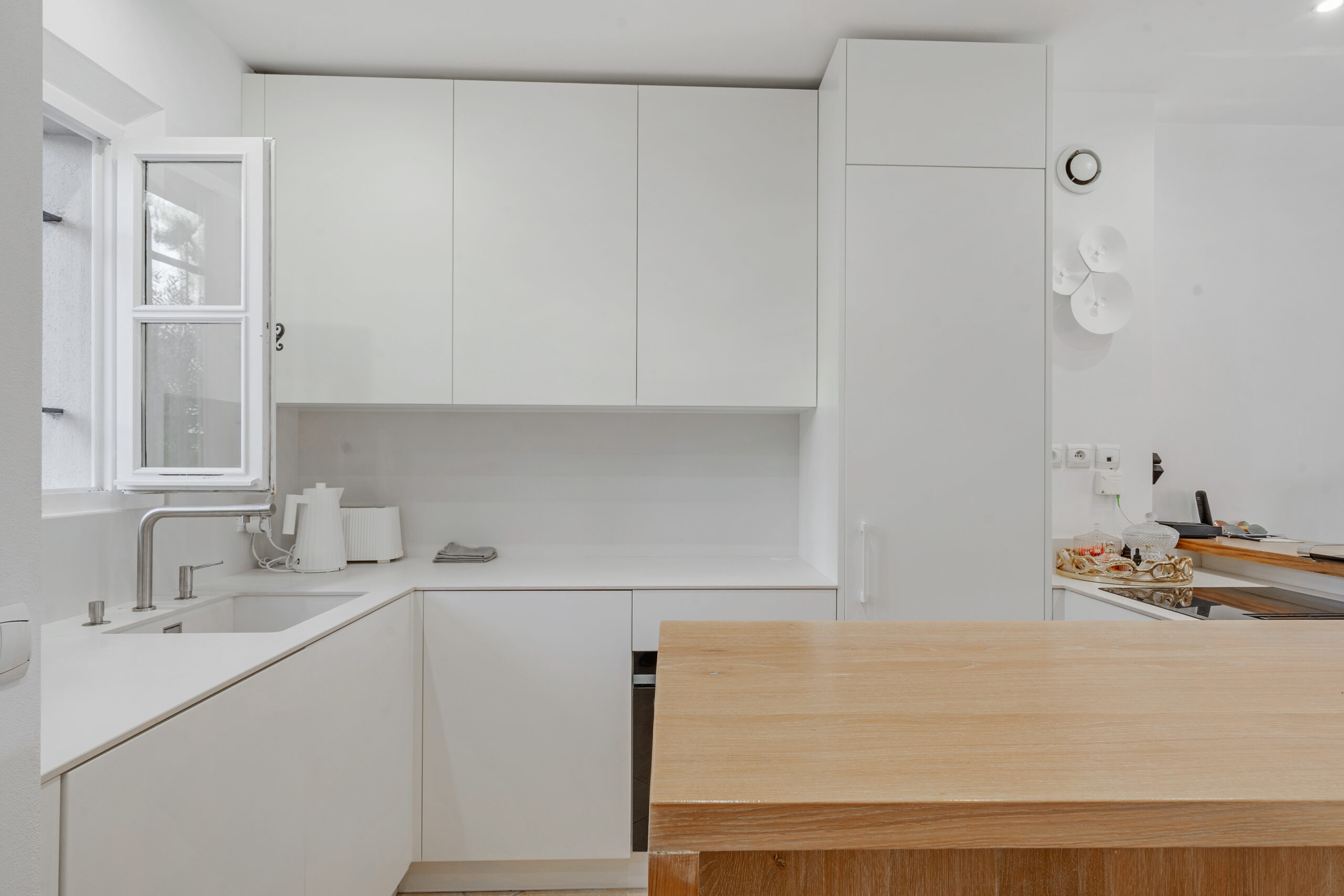 The living area, with a fully equipped kitchen opening onto the lounge, is distinguished by its brightness thanks to its white tones and large opening to the outside.