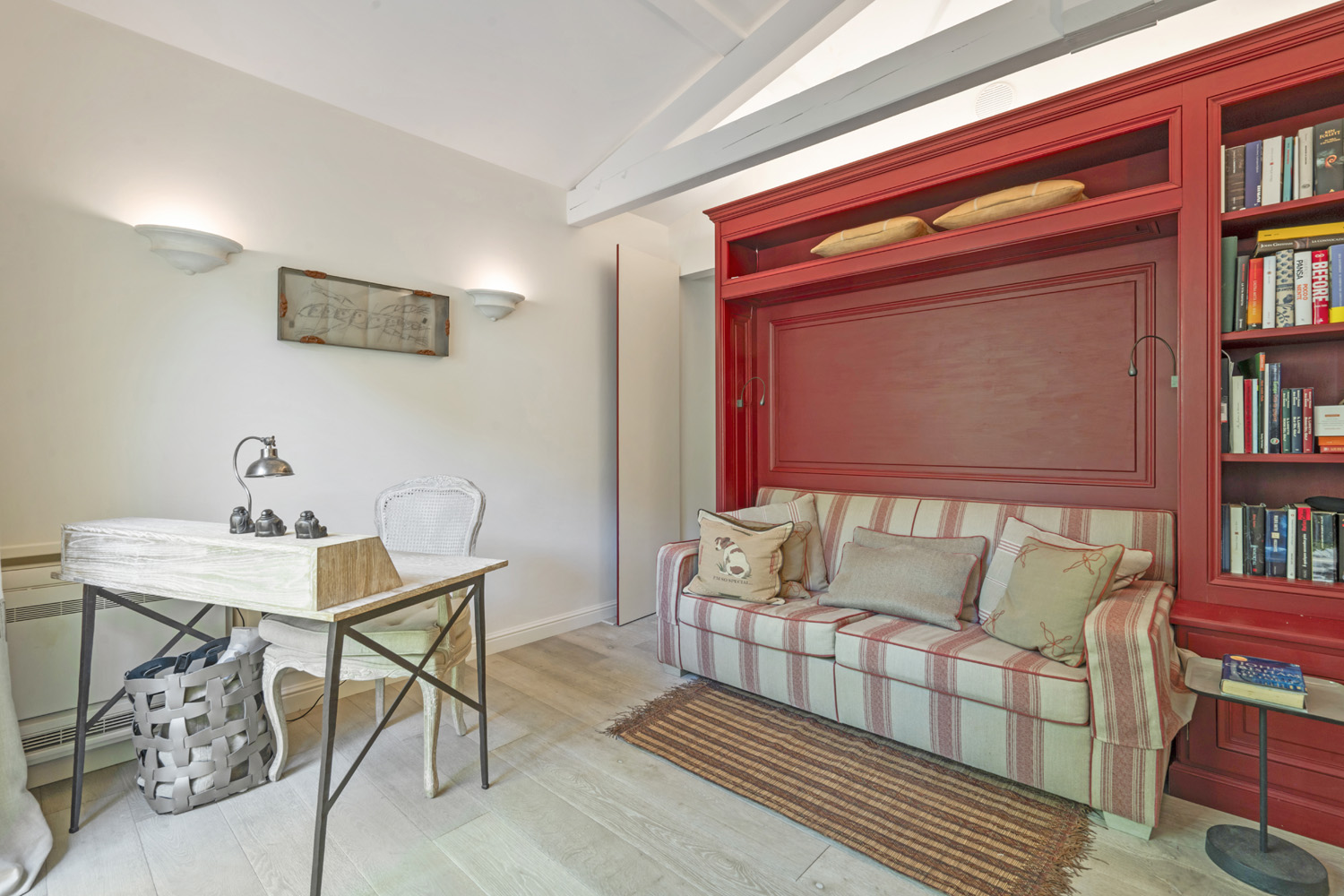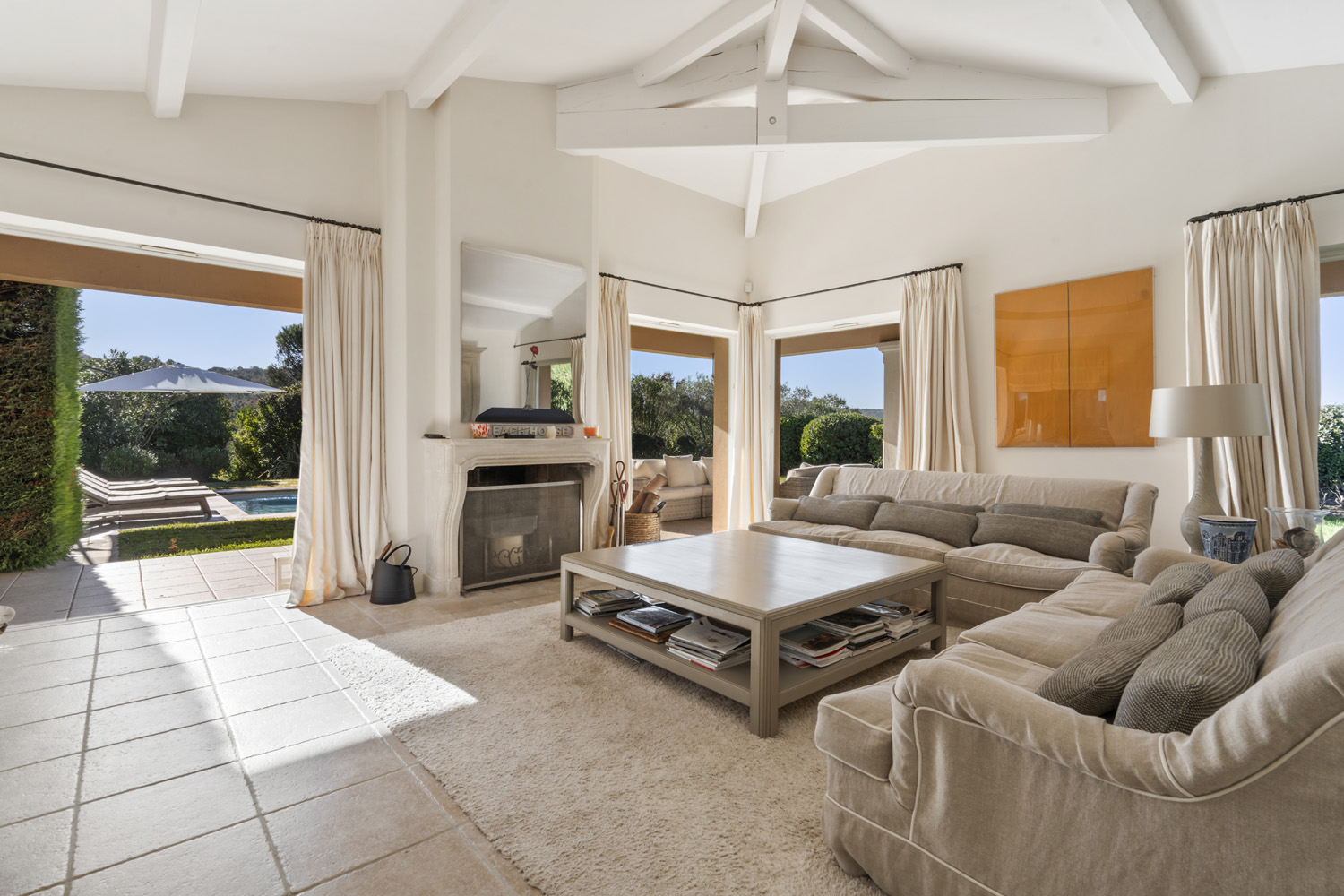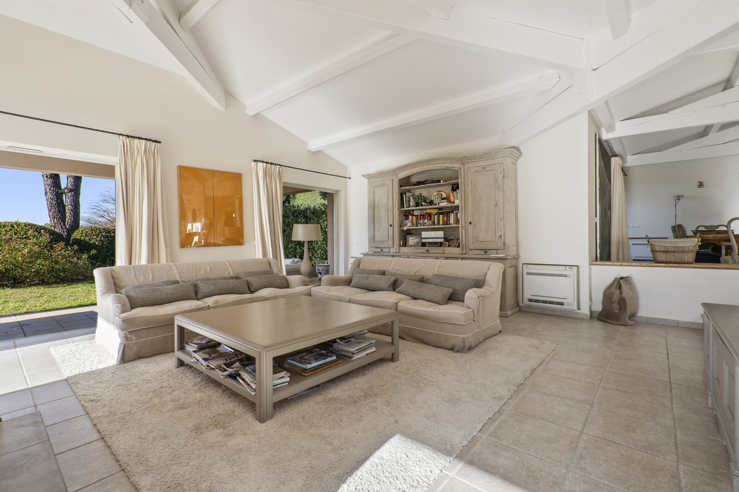 The living space stands out for its brightness, thanks to its white and beige tones and large windows opening onto the outside.